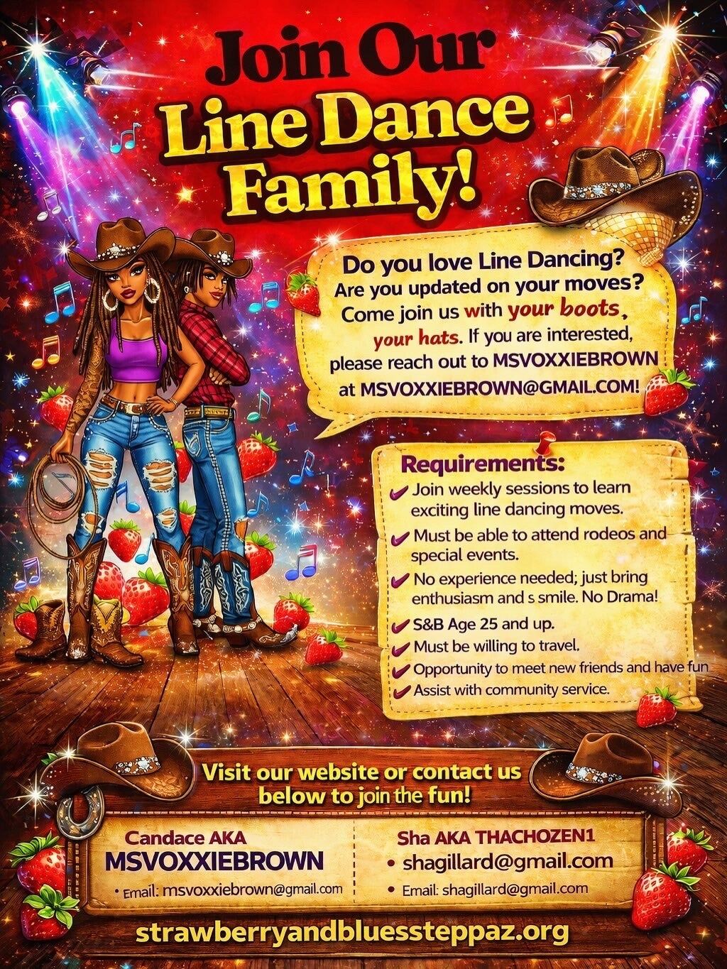Get to know STRAWBERRY AND BLUES STEPPAZ! Learn about our story, our mission, and what makes us a unique and fun-loving line dancing community. Join us as we step into rhythm and create lasting memories together.